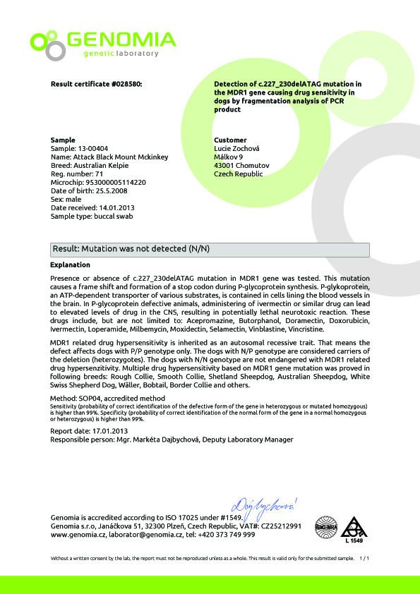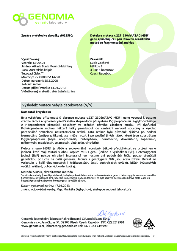 Přišli výsledky vyšetření AGieSka na MDR1 s výsledkem: Mutace nebyla detekována (N/N) ... skvělý :-)